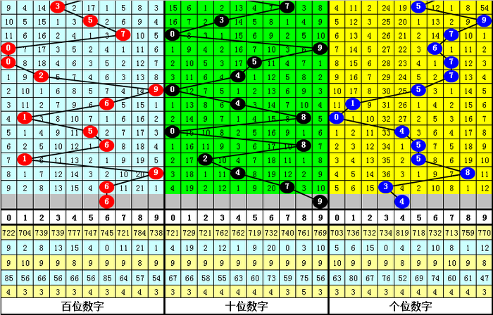 百位上期开出号码6,为偶数,偶数号最近出现次数较少,当今开出1期,渐渐回补,本期退避再次出现,祥和6。 十位上期出号7,大号,大号证明相对较冷,上期出现大号之后,近期看好大号邻接回补,本期再开大号,祥和号码9。 个位号码上期为3,质号,合号近期开出频次较低,上期走冷之后,本期看好合号再次开出,参考号码4。